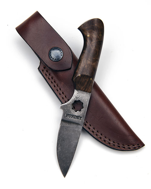 with 2 1/2in. damascus steel blade signed 'PURDEY', walnut handle, bridle leather belt scabbard
