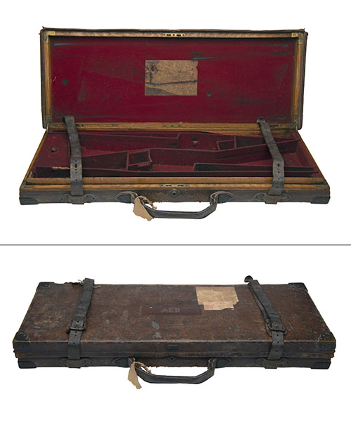 fitted for 30in. barrels, the interior lined with red baize, the trade label has been removed, central brass push-button lock (key missing), the lid exterior with the initials 'AEB', generally distressed inside and out
