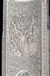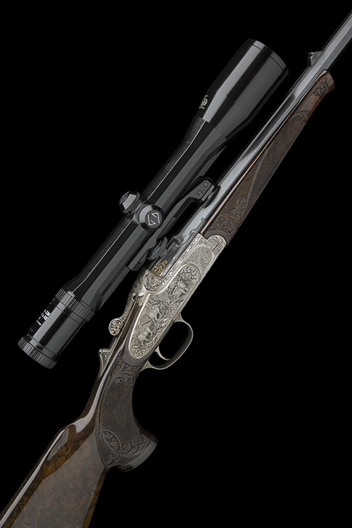 28in. ported octagonal nitro barrel with ramp-mounted open sights, ramp-mounted bead foresight, partially matted top flat with a banner inscribed 'K.H. DANGEL - ULM', the breech end mounted with a Carl Zeiss 150 Year anniversary Diavari-ZM 2,5-10x28 T* telescopic sight, serial no. 2128775, in quickly-detachable mounts, lightweight action with sprung breech face, pieced toplever monogrammed 'HS', sprung safety / cocking lever, the action and furniture engraved with bold acanthus scrollwork, the sideplates carved in high relief with scenes of leopard and gazelle and signed 'R. Schmidt' on the left and with warthog on the right, the underside with a kudu, bright finish overall, 13 3/4in. highly-figured pistolgrip stock with sculpted cheekpiece and hogsback comb, birdshead pistolgrip with a pistolgrip-cap engraved with a further kudu, the chequering bordered with finely carved acanthus flourishes, sling swivels, 1/2in. rubber recoil pad, weight 6lb. (unscoped) and 7lb. 15oz. (with scope)