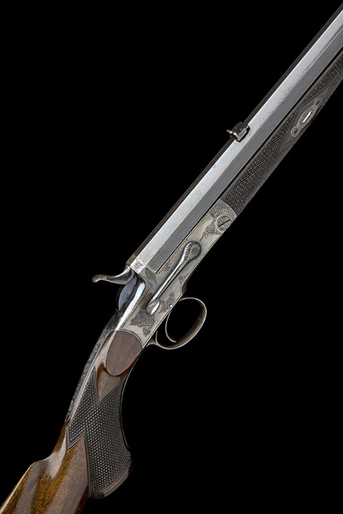 24in. nitro reproved octagonal barrel (reproved for .410 2in. 80grs. ball ammunition, originally likely .360 No.5 rook calibre) with matted top flat, banner engraved 'J. WOODWARD & SONS. 64 ST. JAMES'S ST. LONDON.', open sights with two folding leaf sights, marked for 50, 100 and 150 yards, bead fore-sight, 2in. chamber, flat numbered 2103, sidelever action numbered 288, fine border and acanthus scroll engraving, retaining traces of colour-hardening and reblued finish, 14 5/8in. figured pistolgrip stock with pistolgrip-cap, sling swivels and steel buttplate, weight 4lb. 11oz.