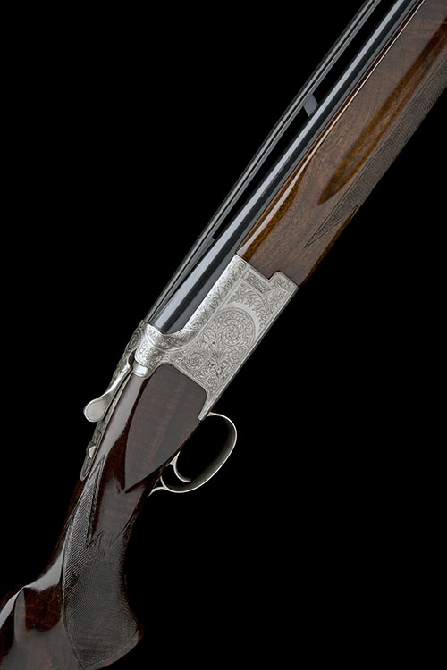 29 1/2in. nitro barrels with partial mid-rib and 12mm ventilated matt top-rib, 2 3/4in. chambers, bored approx. 1/4 choke in both, hold-open toplever, manual safety with integral barrel selector switch, beaded border and floral scroll engraving, brushed finish, 14 1/2in. pistolgrip stock including 1 1/4in. extension, weight 7lb. 15oz.