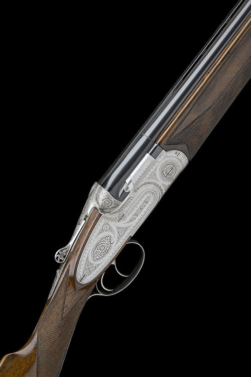 27 1/2in. nitro barrels with 7mm ventilated matt top-rib, 2 3/4in. chambers, bored approx. 3/4 and full choke, hold-open toplever pierced with a rose and inlaid with a pigeon, manual safety, floral and acanthus scroll engraving, bright finish, 14 1/4in. figured stock including buttplate, missing rear sling swivel, chequering refreshed, weight 6lb. 13oz.