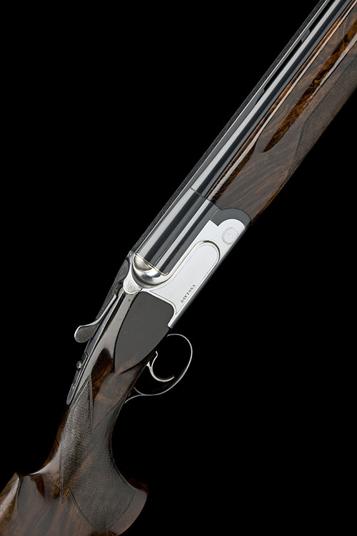 30in. nitro barrels with ventilated mid-rib and 10mm ventilated matt top-rib, applied high visibility fore-sight (missing insert), 2 3/4in. chambers, bored approx. 1/2 choke both, hold-open toplever, manual safety, border engraving, silver action, 14 1/4in. figured pistolgrip stock (crack at hand) with palm swell, including 3/4in. rubber recoil pad, weight 8lb.