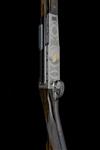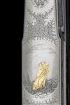 hold-open toplever, manual safety, action finely engraved with floral bouquets and acanthus scrollwork, the underside gold-inlaid with a labrador retrieving a cock pheasant, signed 'inc. Dassa', bright and blued finish overall, 14 3/8in. figured stock (cracked at hand) with sling swivels, weight 8lb. 5oz., in its leather case with provision for the 26 3/4in. barrels