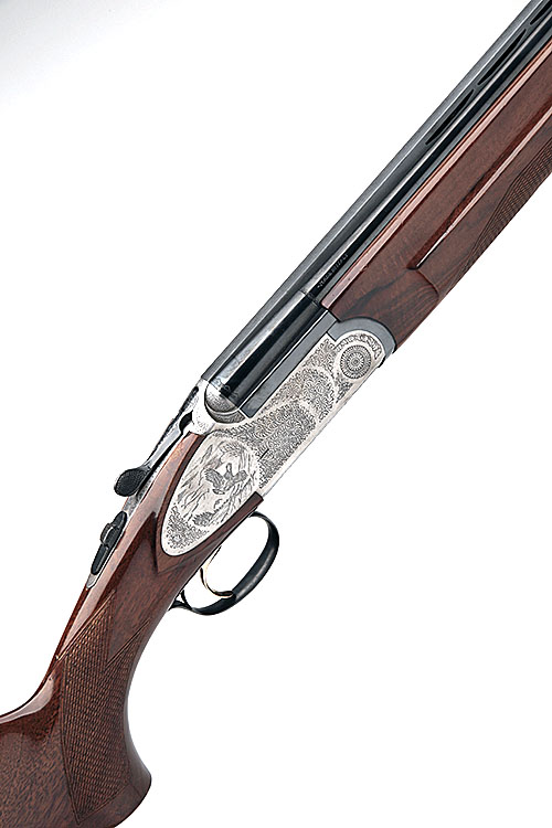hold-open toplever (not totally holding open), manual safety with integral barrel selector switch, acanthus scroll engraving, the decorative sideplates with game scene engraving, 14 1/4in. pistolgrip stock including 3/4in. ventilated rubber recoil pad, weight 7lb. 14oz., in a padded universal case