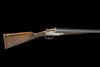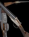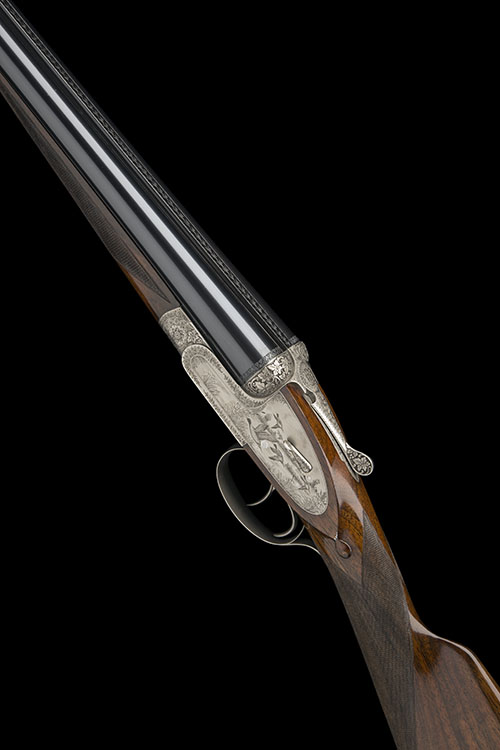 26 3/4in. (68cm) nitro chopperlump barrels, tapered rib finely engraved with overlapping leaf motifs, 2 3/4in. chambers, bored approx. true cyl. and 1/2 choke, left wall at 18, fences finely carved in high relief with leaf and berry motifs, the toplever carved en suite, removable striker discs, no safety catch, hand-detachable lockplates, articulated front trigger, rolled-edge triggerguard, fine acanthus scroll engraving surrounding game scenes of duck in wetland setting to the left, pointer flushing partridge in a farmland setting to the right, the underside with a spaniel and woodcock, the triggerplate signed 'Freycon M.O.F.', bright finish, 14 1/2in. figured stock including 7/8in. rubber recoil pad, weight 6lb. 7oz., in its brass-cornered oak and leather case