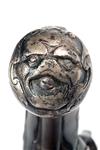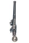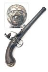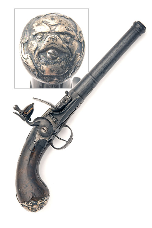 circa 1740, with banded tapering cannon-muzzled 5 1/4in. turn-off barrel (frozen), octagonal form breech signed on the underside 'SEGALAS LONDON', dove-tailed and screwed top-tang, boxlock side-hammer action of typical form with carved 'L' shaped frizzen spring, carved tear-drops to the smooth bag-shaped butt swelling at the pommel and fitted with a white-metal grotesque mask butt-cap, feather edged white-metal escutcheon at wrist and pierced sideplate in the form of a mythical serpent, applied trigger-guard bow with integral tang and finial, no provision for ramrod