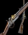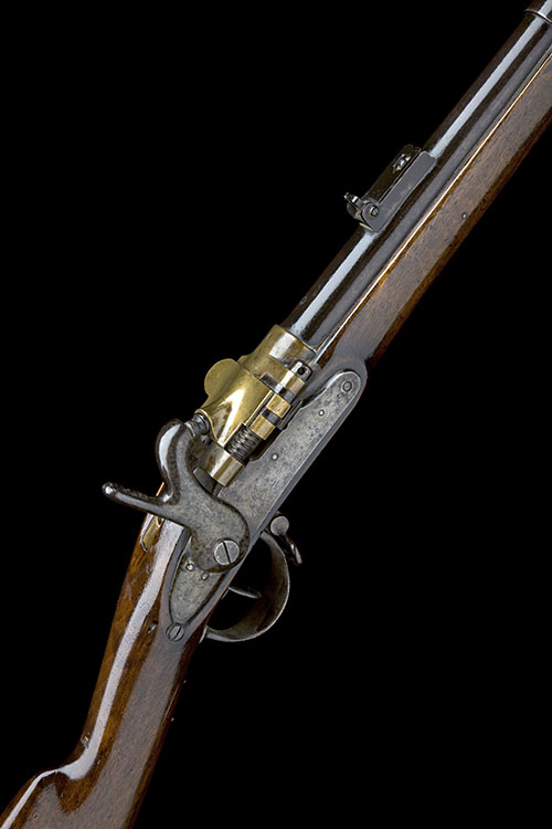 French circa 1854 and being a direct conversion of a Charville rifled musket to breech-loading, with 39in. barrel, blade fore-sight, elevating ladder rear-sight, swing-open brass breech-block and receiver with guide ramp running into the wrist, plain hump-back lock with side-hammer (sear at fault), walnut three-quarter stock, iron furniture and iron under-barrel ramrod