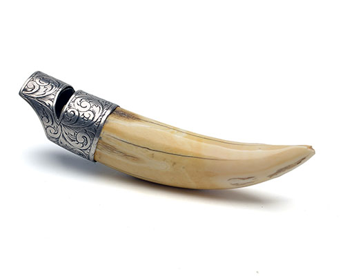 A VICTORIAN SILVER-MOUNTED 'TIGER-TOOTH' WHISTLE,