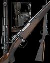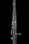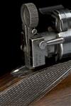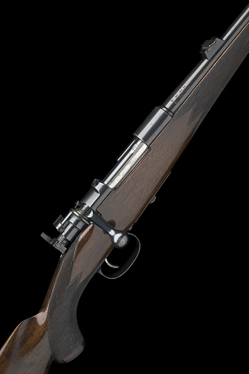 24in. unsigned nitro barrel (Birmingham proof marks only) with block-mounted folding leaf sight and ramp-mounted bead fore-sight, barrel, underside of receiver and stock numbered 3900, unsigned receiver (with thumb cutout), the underside of receiver, stock and steel buttplate numbered 24059, further number 56358 to underside of receiver with bolt numbered 6358, trigger group, flag safety and bolt sleeve numbered 58, the bolt fitted with a Fraser patent adjustable folding peep sight, hinged floorplate with lever release, slim well-figured pistolgrip stock with horn pistolgrip-cap and fore-end finial, ovate insert to hand (likely cover for fitting a wrist mounted peepsight), sling eyes, 14 1/4in. pull including steel buttplate, weight 6lb. 3oz.
