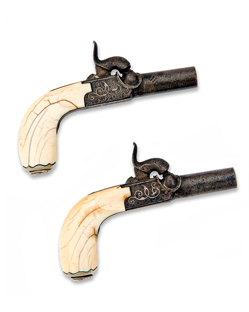A FINE PAIR OF 54-BORE PERCUSSION SILVER & GILT INLAID MUFF-PISTOLS WITH IVORY BUTTS, serial no's. 74,