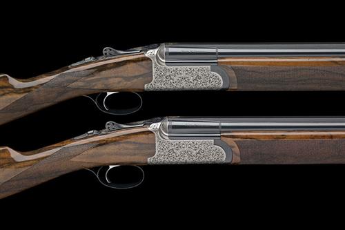 29in. nitro barrels tapered solid matt top-ribs, gold-inlaid '1' and '2' at the breech ends, 3in. chambers, bored approx. 1/4 and 1/2 choke, pierced hold-open toplevers gold-inlaid '1' and '2', automatic safeties with integral barrel selector switches, Italian actions fully scroll engraved and with depictions of the Macnab to the undersides, triggerplates marked 'Bottega C. Giovanelli', bright finish, 16 1/4in. stocks including 7/8in. wooden extensions, No.1 fore-end mismatched (serial no. 45706), weight 6lb. 11oz., in their case