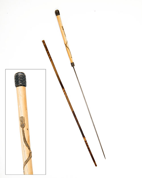 circa 1820, the six-sided 17in. spike with carved ivory hilt in imitation of rope tassels, white metal basket-weave mounts (indistinct signature on pommel) and natural bamboo scabbard with burnt decoration (whip-end missing)