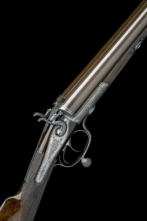 29in. nitro reproved bold damascus barrels, rib re-engraved '1' and 'MASH. 10. WIGMORE STREET. LONDON.', (sic), 2 1/2in. chambers, bored approx. true cyl. in both, the breech ends with filled pinfire apertures, the extractor with an external flange marked 'MASU PATENT', carved serpentine pinfire fences, Jones patent rotary-underlever, permanently attached fore-end, rebounding back-action locks, acanthus scroll engraving, 14 7/8in. figured stock (cracked and repaired at hand) with steel buttplate, weight 7lb. 3oz.