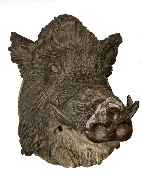 A FRENCH CAST IRON WALL-MOUNTED MODEL OF A BOAR'S HEAD TROPHY,