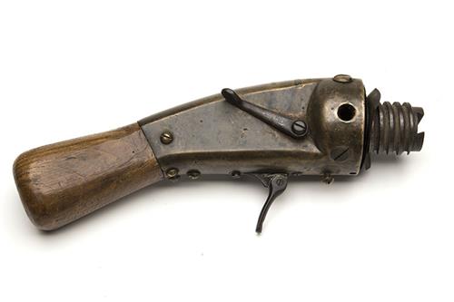 circa 1880, 14in. overall including coarse threaded front section designed to accept a dove-tailed base cartridge of approximately 1 1/2in. bore, bronze action body signed 'CONVERTED TO WM MOORE & GREYS IMPROVED PATENT BREECH LOADER No 2831', side lever cocking, long trigger-blade with aperture for rope release and bag-shaped walnut 'tiller'