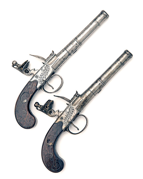 circa 1780, with turn-off 3 3/8in. cannon barrels (frozen), private proofs, squared borderline engraved action signed in central scrolling banners, central hammers with sliding trigger-guard safes and slab-sided walnut butts inlaid with silver wire scrolls (small losses)
