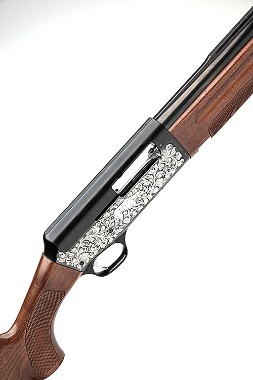 LUIGI FRANCHI 12-BORE '48/AL HUNTER' SEMI-AUTO SHOTGUN, serial no. D60047, 28in. nitro barrel with 6mm raised ventilated matte rib, 2 3/4in. chamber, bored approx. 3/4 choke, blacked action with silver panels engraved with acanthus scroll surrounding hounds on point, push-button safety, 14 1/4in. pistolgrip stock including trademark buttplate, weight 6lb. 14oz.