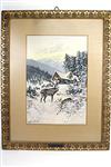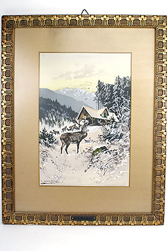 A PAINTING OF A ELEVEN POINT STAG WITH DOE IN A MOUNTAIN WINTER SETTING BY E. HELLER,