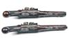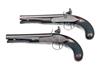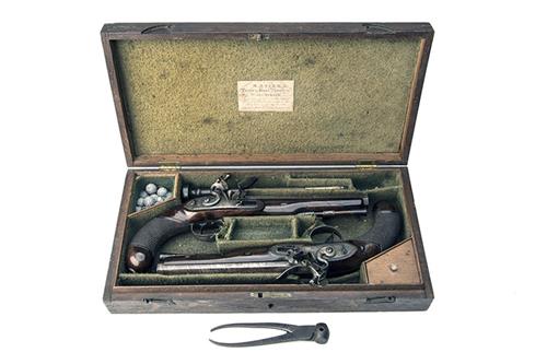 circa 1800, with twist iron 8in. octagonal barrels, bead fore-sights, engraved bands at breech, gold-lined touch-holes, engraved top-tangs, borderline engraved bevel-edged locks with stepped and pointed tails signed forwards of the hammers 'HARTSHORN', sliding safes behind the hammers, rainproof pans, roller frizzens, walnut full-stocks with coarsely chequered bag-shaped butts, set-triggers, double roll-edged guards and twin plain barrel-keys, horn tipped wood ramrods, both pistols retaining traces of original colour and finish and in a retailer's oak case lined and compartmented in coarse green baize, parchment trade label inside lid for 'R. ESSEX, 224 STRAND, LONDON', the case tray containing a loading rod and scissors ball mould
