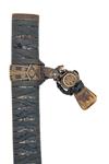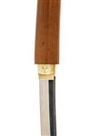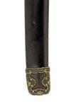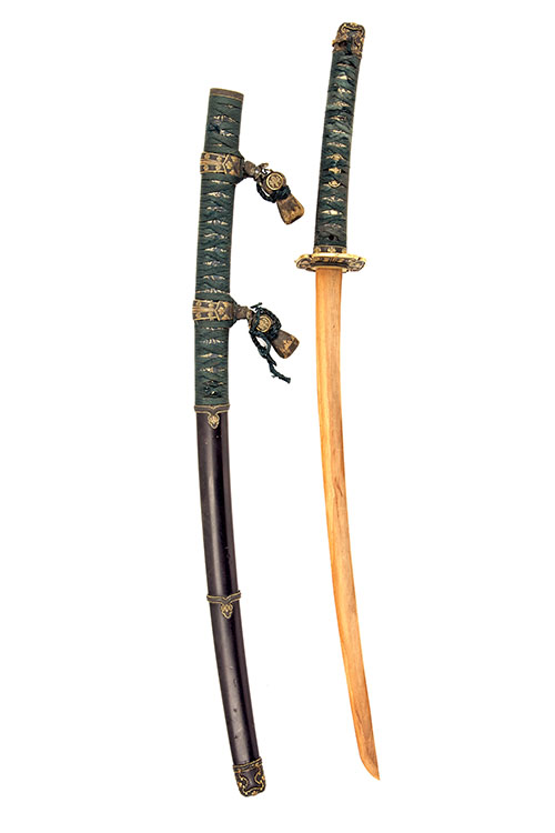 attributed to 'Hokkyo' circa 1640, with curving 29in. re-polished blade, unsigned tang with three mount holes, the 'habaki' engraved with a circular 'mon', the whole contained within a shira-saya, together with a court mounting, the hilt bound in green cotton, gilded mounts and tsuba, black laquered saya, the top half bound in green cotton over a gilt embroidered material with twin en-suite suspension mounts (fragile) complete with a wood keeper blade and signed blue and buff papers