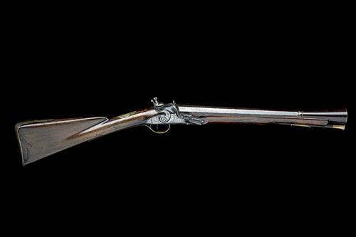 circa 1770, with octagonal 16 1/2in. iron barrel with flared round trumpet muzzle banded at the intersection, traces of maker's details and address to top-flat, engraved flat lock with stepped pointed tail signed forwards of the hammer 'F. INNES', plain frizzen, walnut handrail full-stock with exposed muzzle, brass furniture including rococo escutcheon to wrist and complex pierced sideplate, acorn finial and brass tipped ebony ramrod (some old repairs to woodwork, iron surfaces stained with some pitting to top-flat