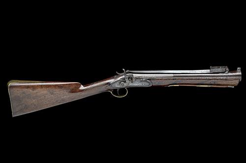 A 20-BORE PERCUSSION BLUNDERBUSS WITH SPRUNG BAYONET, SIGNATURE OBSCURED, serial no. A-N 3354,