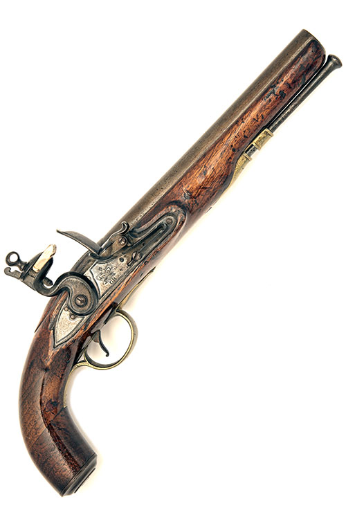 circa 1805, with round 9in. barrel, solid top-tang, London proofs, borderline engraved military style lock marked with a crown over 'GR' below the pan, walnut full-stock, the pommel a later replacement and mushroom-headed iron ramrod