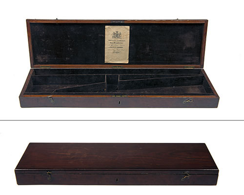 lined and compartmented in brown velvet for a maximum of 31 1/2in. barrels, parchment 'WESTLEY RICHARDS' label (possibly re-attached) with '170 NEW BOND STREET' address, the outer with twin external hook catches and central lock complete with key