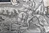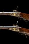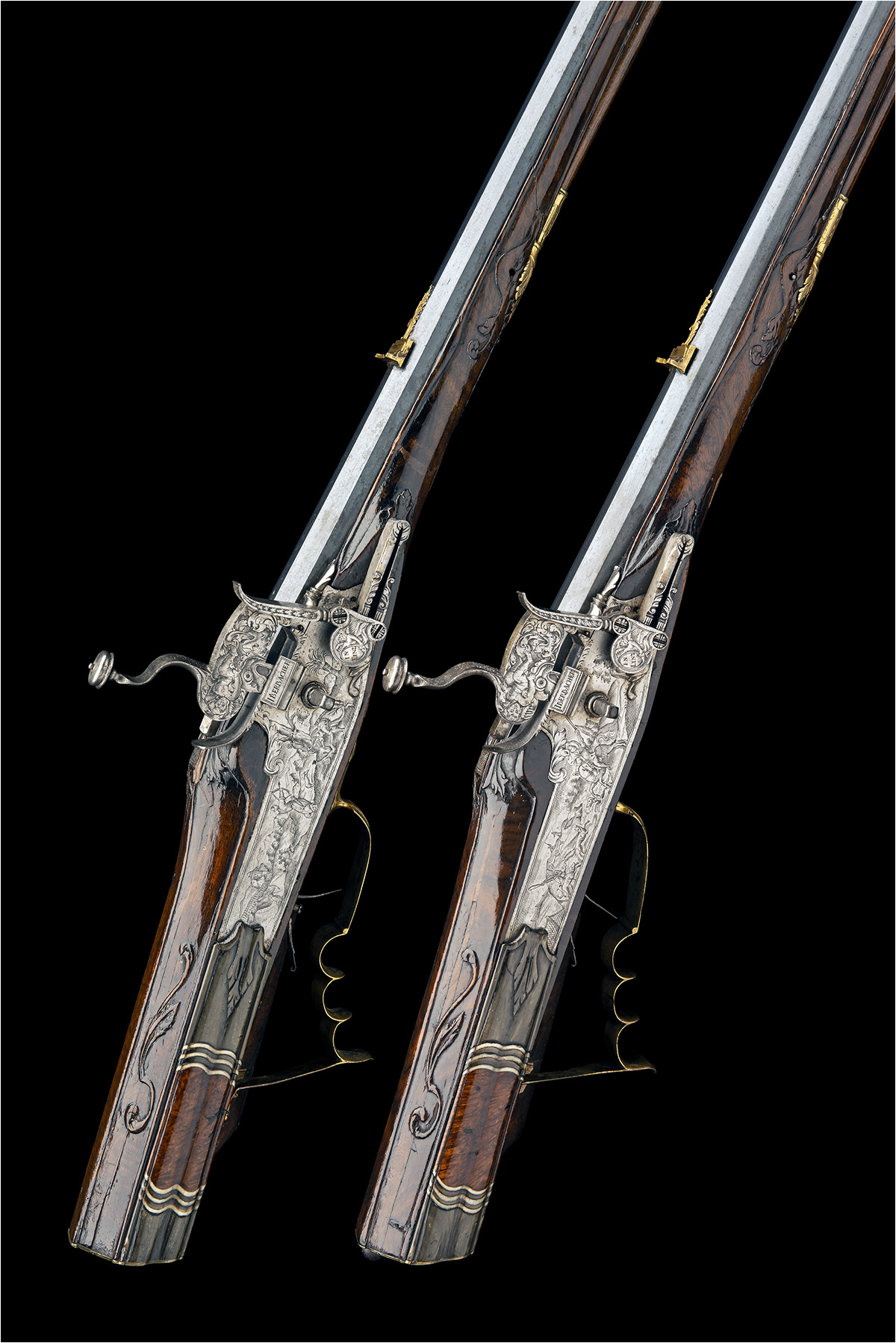 Austrian, dated for 1652, with slightly swamped, reblued octagonal 32 3/4in. barrels, the top-flat signed MATHEVS MATL. 1652', gilded dove-tailed fore-sights and gilded standing notch rear-sights with an additional folding leaf and feathered foot, twin engraved bands at breech together with their respective gothic number '1' or '2' of a pair inlet in gold, engraved brushed bright top-tang, large slab-sided locks engraved with scenes of hunters both on foot and horseback hunting beasts with hounds, the pan sides signed 'IBERBACHER', the bridles engraved with a cherub holding a shield signed 'IN LINZ', the cocks engraved with cherubs combating mythical beasts, walnut full-stocks with triangular cross-section butts, the stocks further carved around the tangs, ramrod channels and furniture, horn, bone and burr walnut facings to the patch-box lids, edges of the cheek-pieces and fore-end tips, all the furniture pieces engraved, carved and gilded, probable original ramrods and both guns with the remnants of old gummed museum labels marked 'STEYR' (woodwork with old repairs and small losses)