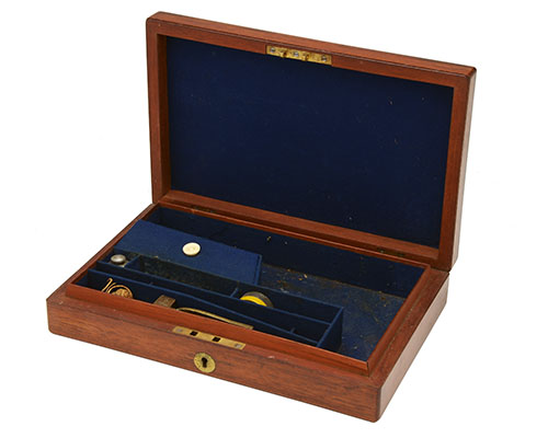 circa 1855, measuring internally 11in. x 6 1/2in. x 1 5/8in., compartmented and lined in blue baize and containing a Colt-type eagle flask (possibly reproduction), a pewter oil bottle, a brass bullet mould, a nipple-key (modern) and a cap-tin