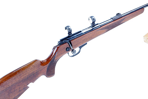 WALTHER .22 L.R. BOLT-MAGAZINE SPORTING RIFLE, serial no. 1330, 22in. nitro barrel, ramp-mounted blade fore-sight, rear-sight missing, fitted with scope rings, manual safety, detachable magazine missing, 14 1/4in. figured pistolgrip stock