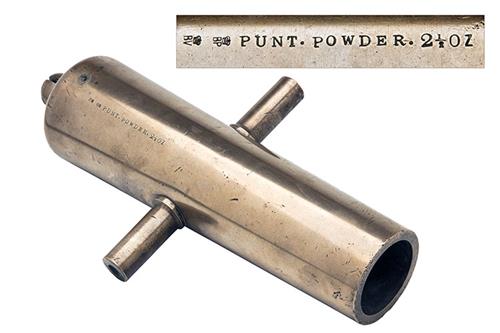 circa 1890, with tapering round 17in. barrel including cascabel, proofed for '2 1/4oz. PUNT POWDER', plain side trunnions, the cascabel slotted and drilled for an elevation screw (absent)