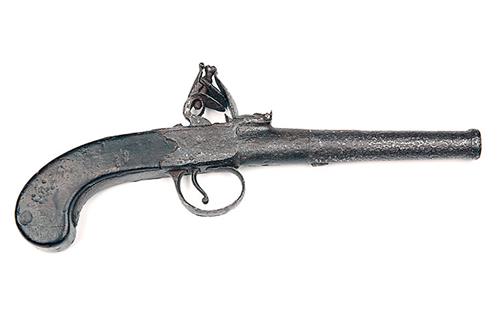A 22-BORE FLINTLOCK CANNON-BARRELLED PISTOL, SIGNATURE OBSCURED, no visible serial number,