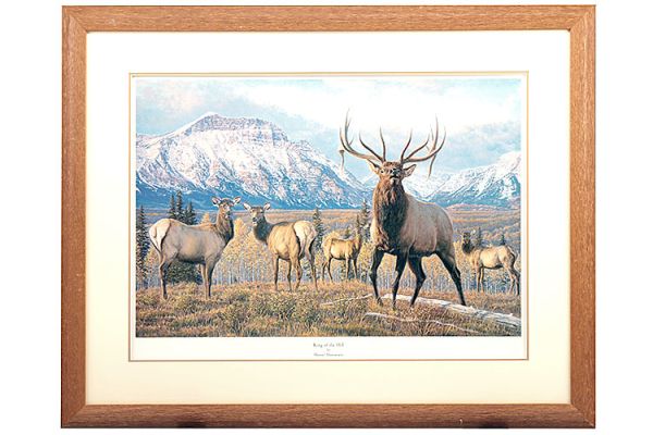 A FRAMED AND GLAZED PRINT OF 'KING OF THE HILL' BY MANUAL MANSANAREZ, showing a heard of elks in the wilderness, measuring approx. 33in. x 25in.