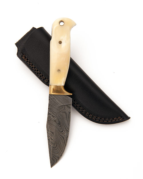4 1/2in. blade, brass guard, mammoth grip scales, lanyard hole, in its leather sheath