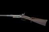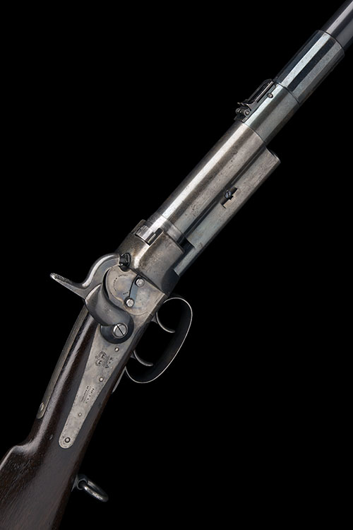 dated for 1856, with blued tapering round 18in. barrel, dove-tailed block and blade fore-sight, elevating ladder rear-sight, central section of outer barrel faceted for grip, plain receiver, long plain top-tang marked 'GREENE'S PATENT JUNE 27 1854', back-action lock-plate fitted with 'Maynard's' tape priming system and marked 'MASS. ARMS CO. CHICOPEE FALLS USA 1856' a 'VR' crown cypher and 'MAYNARD'S PATENT SEPT 22 1845', plain hammer, walnut butt-stock with iron patch-box and semi-crescent heel-plate, saddle-ring to the trigger-guard tang, large trigger-guard bow with two triggers, the front one unlocking the barrel for loading and no provision for fore-end, the whole retaining much finish, (faded on receiver)
