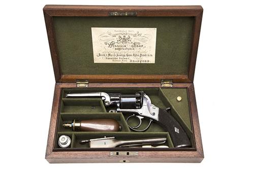 circa 1855, with blued octagonal 4 3/8in. barrel, tramlines engraved at muzzle, bead fore-sight, the top-flat signed 'WILLIAM EGAN, BRADFORD', articulated rammer mounted to left side of barrel, wingnut barrel release, borderline engraved blued open frame, plain blued cylinder with tramlines to leading edge, 'J' shaped safety spring, spur-less hammer, chequered walnut grips with saw-handle spur, iron butt-cap and guarded trigger, complete with its maker's walnut storage case lined and compartmented in green baize, parchment trade label inside lid and complete with a Robert Adams trademarked mould, a small Dixon bag shaped flask retaining virtually all its finish and a turned oil-bottle, the pistol and case contents appearing little used