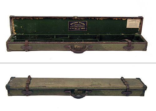 fitted for a rifle measuring 46 1/2in., the interior lined with green baize (moth damage), with William Evans leather gold-tooled trade label