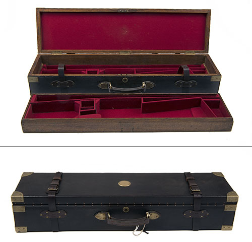 A RESTORED BRASS-BOUND OAK AND LEATHER TWO-TIERED DOUBLE HAMMERGUN CASE,
