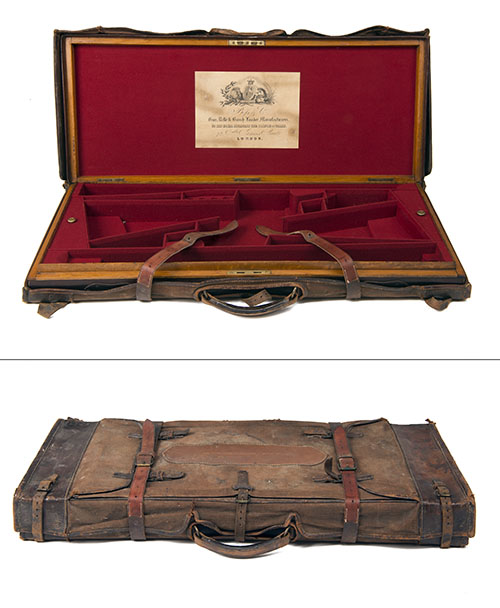 re-lined interior fitted for 29in. barrels (would adapt to 30in.), reproduction Boss & Co. trade label, with canvas and leather outer cover with front pouch