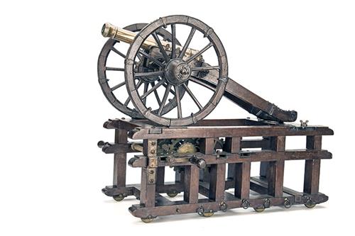 circa 1810, believed to be a classroom model to demonstrate a device allowing the deployment and withdrawal of a field-gun within a rotating fortress turret, the cannon of 38-bore, with 10 1/2in. bronze barrel including ringed cascabel and banded in typical period fashion, mounted on a wood carriage with iron trunnion clamps with a square beam single axle supporting iron bound multiple spoke wooden wheels, the whole mounted on a complex framework or scaffold with eight small brass wheels to the underside and a series of drums and gears to allow the winding or releasing of rope together with various hooks and eyes assumed to be part of the same process, the top of framework with an oval makers stamp, possibly 'MODEL L'art'ia', the underside with label reading 'Antonio's Antiques' together with an inventory number