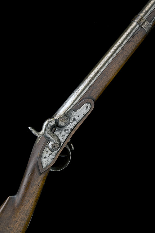 probably Belgian or Swiss and converted from flint circa 1840, with plain iron 40 1/2in. barrel, boat-shaped fore-sight applied to the nose-cap band, no provision for rear-sight, the serial number beneath the roman numeral 'III' at breech, plain military style lock retaining fenced pan cut-out and plugged holes, sculpted hammer, walnut full-stock with iron furniture, no finger ribs to lower tang, two barrel-bands and double banded nose-cap, iron ramrod with conical tip, the whole with patchy staining to exposed iron surfaces and complete with an iron socket bayonet for the same model in similar condition (no scabbard)