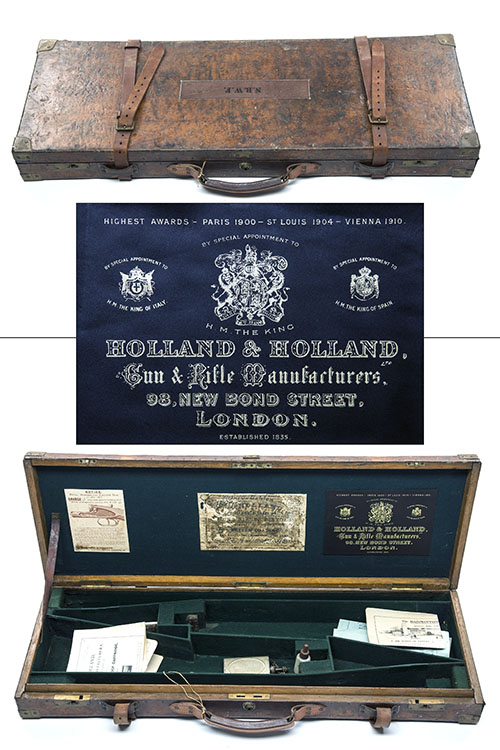 fitted for 28in. barrels (could adapt to 31in.), the interior lined with green baize, an H. Holland trade label and a Holland & Holland trade label, central brass push-button lock (including key), two brass clasps, the lid exterior with the initials 'N.R.W.F.'