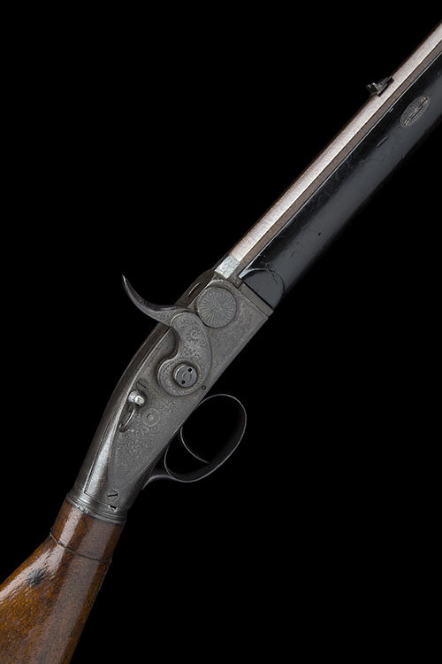 English circa 1840, with re-browned octagonal micro-rifled 30in. barrel with detachable micro-rifled brass full-length insert, dove-tailed blade fore-sight, standing notch rear-sight with two additional folding leaves, border and scroll engraved tap-action receiver, rotating safe and cocking hammer to the right hand side, leather re-covered stock air-reservoir with shotgun butt, guarded trigger, walnut fore-end with horn nose-cap and provision for ramrod (missing)