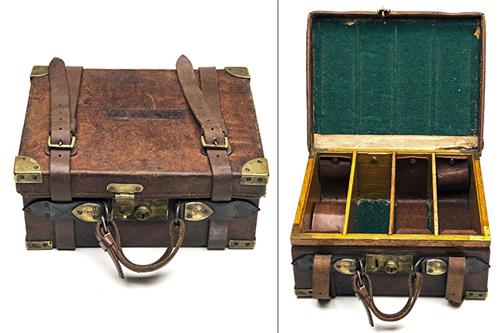 fitted for approx. 100 cartridges, oak and green baize interior (some repairs), three oak dividers, four leather lifters (one missing), brass lock (key missing)