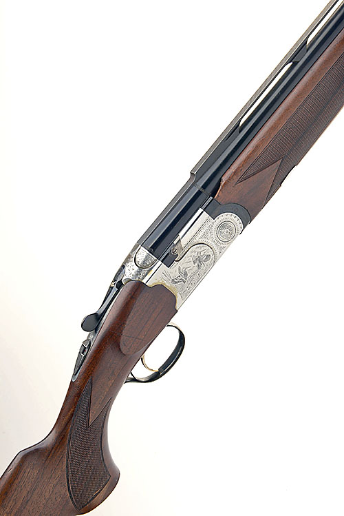 BERETTA 12-BORE 'MOD. S687' SINGLE-TRIGGER OVER AND UNDER EJECTOR, serial no. E41518B, 29 1/2in. nitro reproved (in 2018) barrels, raised ventilated 9mm matt rib, ventilated mid rib, 2 3/4in. chambers, multichoke (no spares), hold-open toplever, manual safety with integral barrel selector switch, gold-washed trigger, border, acanthus scroll and floral bouquet engraving surrounding scenes of a hound on the left and woodcock on the right, 14in. pistolgrip stock including wooden buttplate, weight 8lb, small chip to fore-end