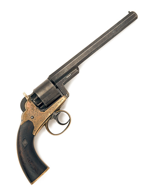 circa 1856, with iron octagonal micro-rifled 7 5/8in. barrel signed on the top-flat 'J. BENTLEY & SONS 40 LIME ST. LIVERPOOL, MAKERS TO H.R.H. PRINCE ALBERT', dove-tailed fore-sight, barrel fixed to the frame by cross-wedge and pin, border and scroll engraved brass open frame (action sticky), the left hand side marked 'BENTLEY'S PATENT No. 51', plain blued cylinder, double action only hammer with provision for hammer safety (missing), smooth walnut grips, engraved brass grip-straps, heel-plate and trigger-guard bow, traces of original finish with some mild shallow pitting