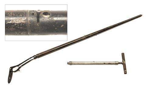 circa 1880, the cane 37 1/4in. overall, with tap-loading 20in. rifled barrel (missing nose-cap), concealed button trigger, detachable straight air reservoir, the end fitted with a later detachable skeleton iron butt, reasonable amount of original black painted finish, together with an amateur fabricated stirrup pump for same