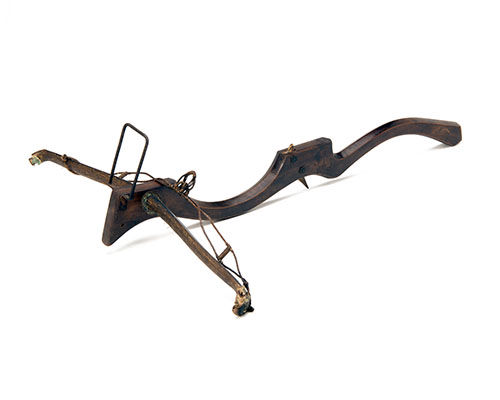 A CHINESE PELLET CROSSBOW probably early to mid 19th century, with distinctive serpentine shaped stock, laminated horn prod, large rectangular wire fore-sight (rear-sight absent), bone trigger and remnants of the original double string